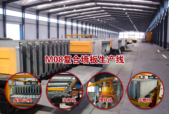 M08復(fù)合墻板生產(chǎn)線主要設(shè)備組成有:集約式低能耗養(yǎng)護室、第三代成組立模、立模回轉(zhuǎn)機、上抹面成型機、第三代液壓抽芯機、壓力注料系統(tǒng)、合板翻板機構(gòu)、推板機構(gòu),標準生產(chǎn)線產(chǎn)能年產(chǎn)達50萬㎡(2440mmX610mm)。