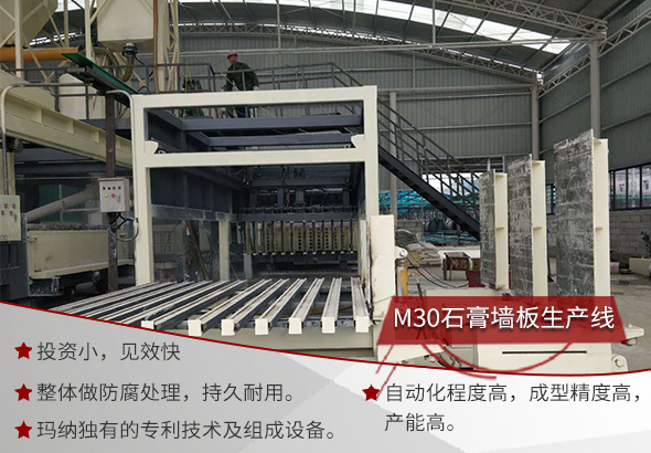 M30型石膏條板生產(chǎn)線是在國外石膏墻板生產(chǎn)工藝基礎(chǔ)上,創(chuàng)新研發(fā)成功的石膏板生產(chǎn)設(shè)備,標(biāo)準(zhǔn)產(chǎn)能為50-100萬㎡,可生產(chǎn)磷石膏、硫石膏、天然石膏等為原料的空心條板。