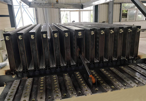 石膏空心墻板生產(chǎn)線主要設(shè)備包括:計(jì)量配料系統(tǒng)、澆注系統(tǒng)、墻板成型機(jī)、抽管系統(tǒng)、自動(dòng)出板機(jī)、墻板翻轉(zhuǎn)機(jī)、擺渡系統(tǒng)、儲(chǔ)料系統(tǒng)。