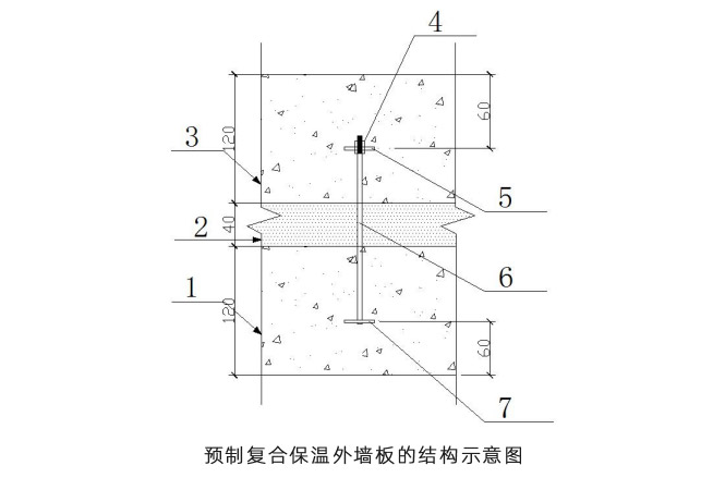其中,1.外葉墻板;2.保溫層;3.內(nèi)葉墻板;4.螺母;5.內(nèi)固定座;6.不銹鋼棒;7.外固定座。
