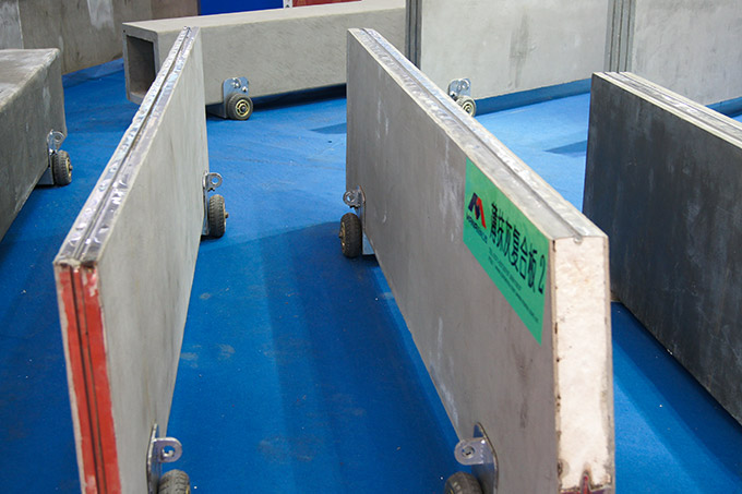 9)預(yù)養(yǎng)護(hù)。混凝土振搗完成后,對外墻板的表面進(jìn)行趕平處理,然后送入預(yù)養(yǎng)窯,預(yù)養(yǎng)護(hù)窯溫度在50℃左右為宜,養(yǎng)護(hù)時間1~1.5h,能夠加速混凝土的初凝和表面硬化,然后進(jìn)行抹光處理,提高外墻板的表面平整度。