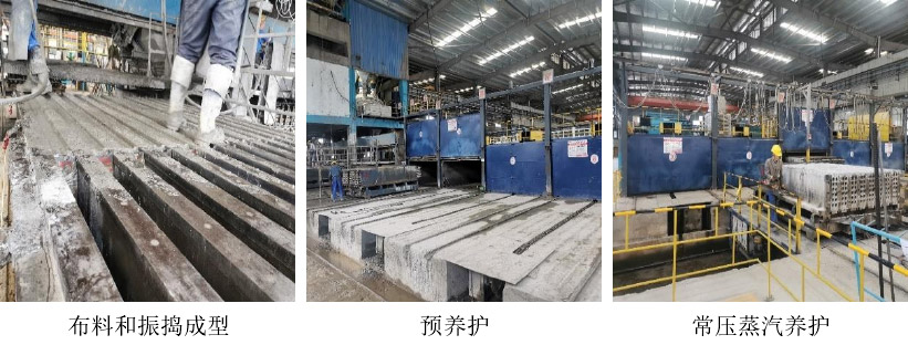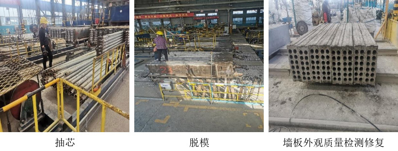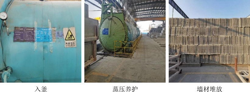 之后進行抽芯處理,經(jīng)過表面質(zhì)量檢測和修復(fù)后,開始進行蒸壓養(yǎng)護處理,蒸壓養(yǎng)護過程分為升壓、恒壓、降壓三個過程:升壓階段(15min 0.10MPa;30min 0.25MPa;45min 0.35MPa;1h 0.50MPa)、恒壓階段(2h、0.5±0.05MPa)、降壓階段(15min 0.40MPa;30min 0.30MPa;45min 0.20MPa;1h 0.15MPa;1h15min 0.10MPa;1h30min 0MPa)、降溫冷卻 30min。