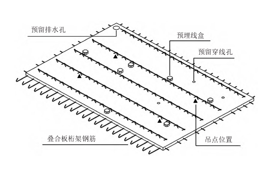 一般由設(shè)計院根據(jù)建設(shè)單位的意圖,按照現(xiàn)澆的標(biāo)準(zhǔn)和要求進(jìn)行結(jié)構(gòu)設(shè)計。預(yù)制構(gòu)件廠在施工圖的基礎(chǔ)上進(jìn)行拆分,將整體建筑拆分成單一構(gòu)件,在充分協(xié)調(diào)各個專業(yè)之后,確保專業(yè)之間無碰撞,即完成圖紙的深化設(shè)計,深化設(shè)計圖紙包括預(yù)留預(yù)埋點位、脫模、吊裝點位及結(jié)構(gòu)配筋詳圖的做法和要求,深化設(shè)計圖紙可以滿足構(gòu)件加工生產(chǎn)和現(xiàn)場安裝的需求,本研究以疊合板深化設(shè)計詳圖為例,深化設(shè)計如下圖所示。
