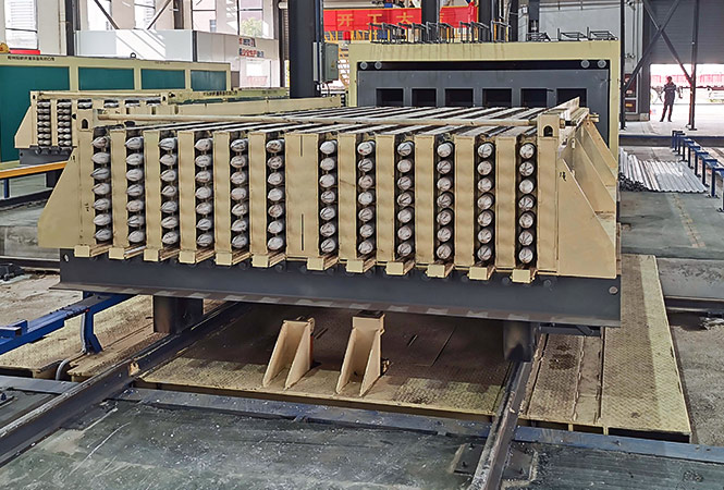 根據(jù)產(chǎn)能要求設(shè)計石膏墻板循環(huán)生產(chǎn)線,生產(chǎn)長度3000mm×寬度600mm×厚度100mm和長度3000mm×寬度600mm×厚度200m兩種規(guī)格產(chǎn)品,既滿足單獨生產(chǎn),同時可混線生產(chǎn),模車計劃100mm配置4套(12塊/模),200mm模車配置4套(6塊/模)。