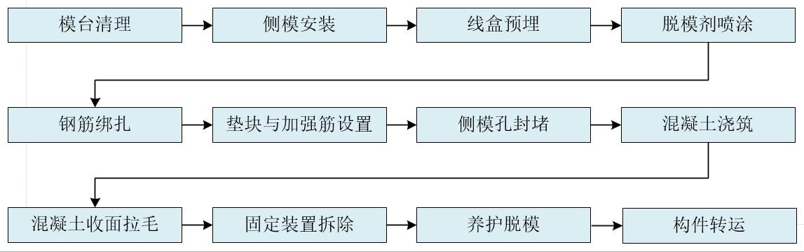 疊合板生產(chǎn)采用模臺流水線生產(chǎn),模臺可整體移動,不同區(qū)域負責不同工藝,每道工藝完成后,模臺移動到下一個區(qū)域。疊合板生產(chǎn)流程如下: