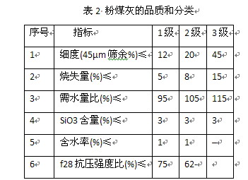 粉煤灰多出于電廠煤粉爐中,由于電廠用電負(fù)荷有高峰和低谷,以及原煤煤種的差異,因此粉煤灰的質(zhì)量是有波動(dòng)的。粉煤灰的品質(zhì)和分類見(jiàn)表2。