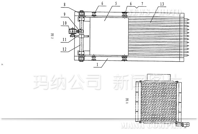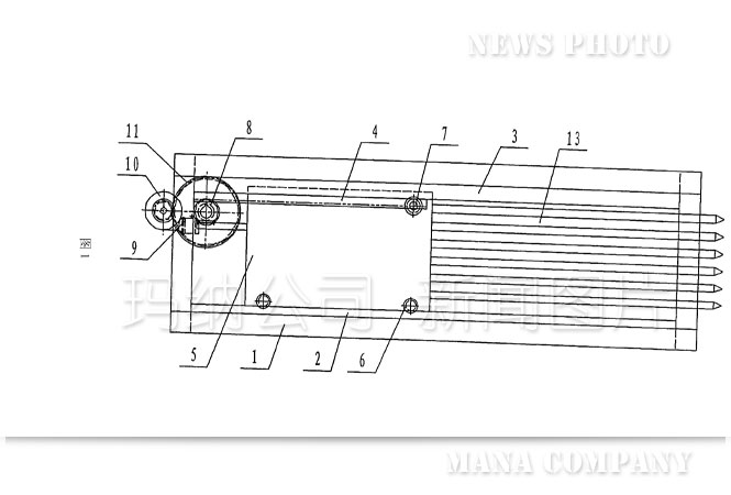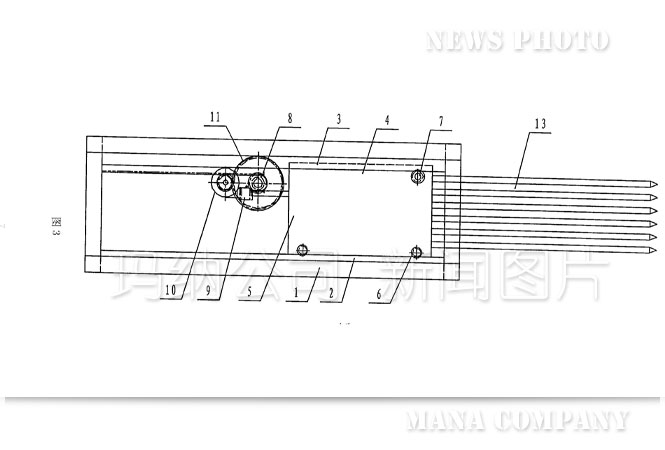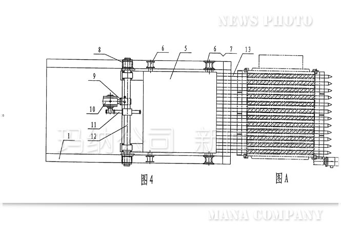 傳統(tǒng)的抽芯機(jī)結(jié)構(gòu)(如圖1——圖4):機(jī)架1上設(shè)置有下導(dǎo)軌2和上導(dǎo)軌3,在上導(dǎo)軌3的后半部分固定有齒條4,行走小車(chē)5上安裝的下滑輪6、上滑輪7、小齒輪8分別與下導(dǎo)軌2、上導(dǎo)軌3、齒條4接觸并能沿之前后移動(dòng),進(jìn)而帶動(dòng)行走小車(chē)5前端連接的芯管13一起向前或向后移動(dòng),即完成多孔墻板在成型過(guò)程中穿、拔芯管的功能。上述運(yùn)動(dòng)是由電機(jī)9、減速機(jī)10、大齒輪11、傳動(dòng)軸12等組成的驅(qū)動(dòng)系統(tǒng)帶動(dòng)行走小車(chē)5上的小齒輪8與齒條4相嚙合來(lái)實(shí)現(xiàn)的。從上述結(jié)構(gòu)可以看到傳統(tǒng)的抽芯機(jī)動(dòng)力傳動(dòng)部分是機(jī)械傳動(dòng):電機(jī)9轉(zhuǎn)動(dòng)——減速機(jī)10調(diào)速、換向——大齒輪11轉(zhuǎn)動(dòng)——傳動(dòng)軸12轉(zhuǎn)動(dòng)——小齒輪8轉(zhuǎn)動(dòng)與齒條4嚙合——行走小車(chē)5和芯管13前后平移,運(yùn)動(dòng)轉(zhuǎn)換次數(shù)多、傳動(dòng)結(jié)構(gòu)復(fù)雜、傳動(dòng)零件種類(lèi)多,從設(shè)計(jì)、制作、使用、檢修都比較麻煩,而且對(duì)芯管位移量的定位也不太精確。