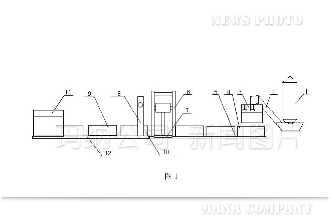通過攪拌混料裝置1將水泥、沙子混合后再通過輸送裝置2輸送至下游的的高壓注漿裝置3,高壓注漿裝置3是將混料通過高壓注漿器注射至接受箱4內(nèi),再經(jīng)過接受箱循環(huán)移動裝置5的循環(huán)移動,其上的接受箱4內(nèi)的無極水泥、沙子、發(fā)泡劑、粘結(jié)劑在一定時間內(nèi)膨脹且凝固成模塊8,再通過起膜裝置6使接受箱4內(nèi)的所述模塊8與所述接受箱4脫離,通過推進裝置7將脫離接受箱4的模塊10推至下游的切割裝置8,脫離后的接受箱4可在接受箱循環(huán)移動裝置5上繼續(xù)循環(huán)使用,模塊8通過下游的切割裝置7切割成一定規(guī)格的保溫板9并通過分支輸送裝置12送至發(fā)泡保溫板包裝機11上進行包裝,實現(xiàn)了阻燃效果好,自動化程度高,生產(chǎn)成本低,生產(chǎn)效率高的效果。