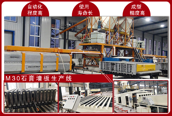 M30石膏墻板生產(chǎn)線是瑪納公司在最新研制機(jī)動成組立模墻板成型工藝的基礎(chǔ)上,引進(jìn)國外先進(jìn)石膏墻板生產(chǎn)工藝,經(jīng)過技術(shù)創(chuàng)新,研制出的新型石膏墻板生產(chǎn)線,具有如下特性: