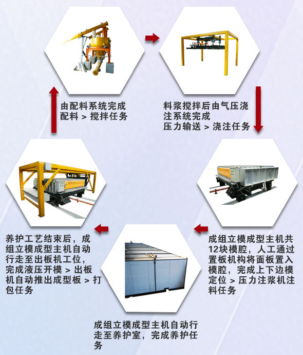 整個(gè)過程:配料→攪拌→置板→壓力輸送→澆注入!B(yǎng)護(hù)→開模→出板機(jī)出板→循環(huán)