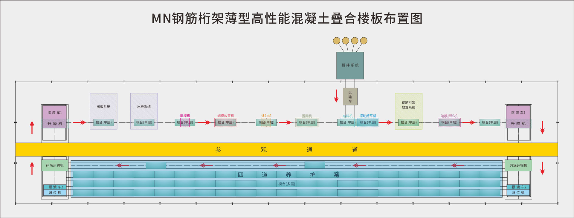 1.功能主機模塊(出板系統(tǒng)、清理系統(tǒng)、自動端模系統(tǒng)、涂油系統(tǒng)、網(wǎng)片布網(wǎng)切割系統(tǒng)、精準布料系統(tǒng)、整平系統(tǒng)(含毛面處理)、桁架定位置入系統(tǒng))。